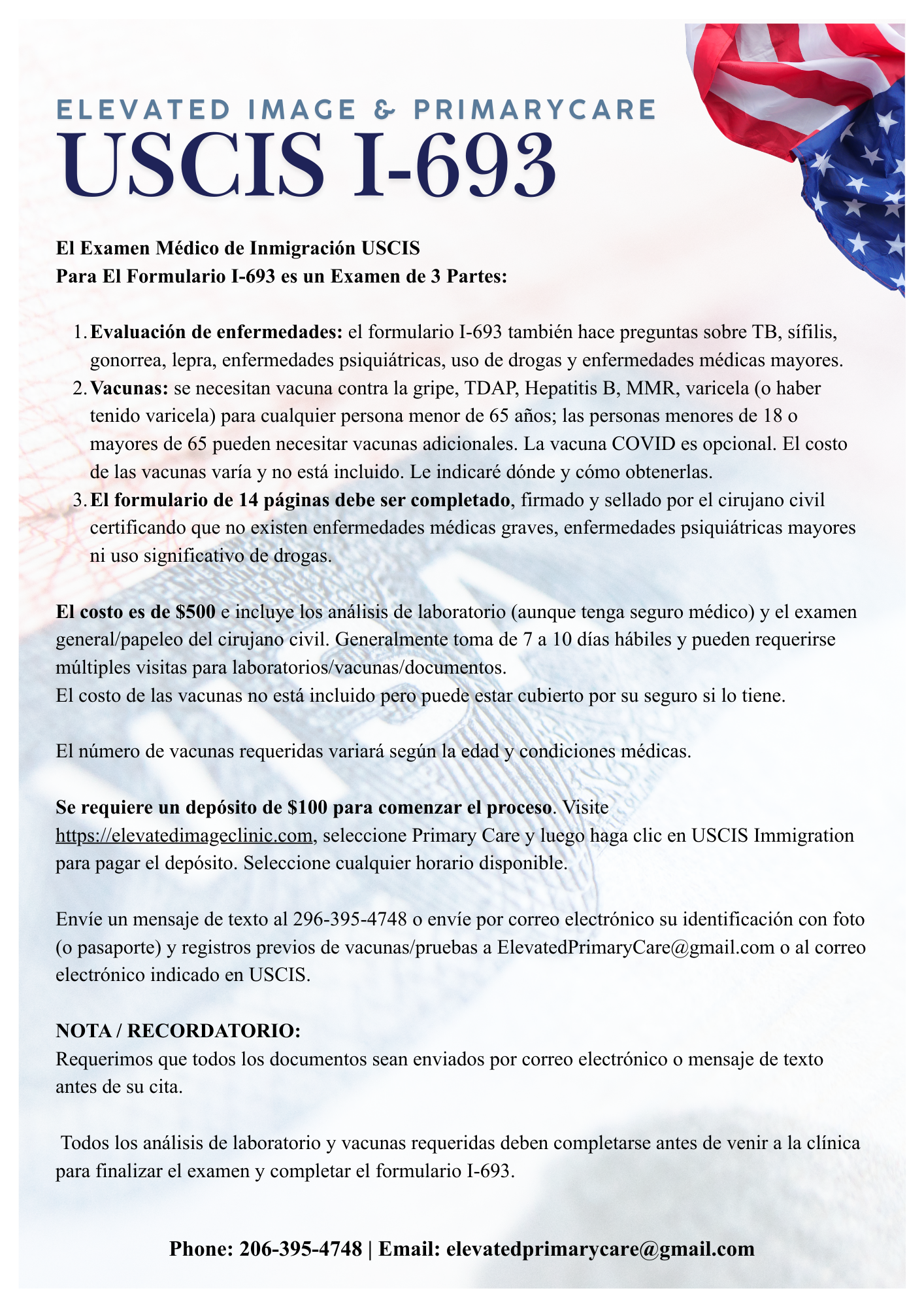 As a USCIS-designated Civil Surgeon, Elevated Primary Care is authorized to perform the required medical examination for applicants seeking adjustment of status (Green Card) in the United States, as documented on Form I-693, Report of Immigration Medical Examination and Vaccination Record.